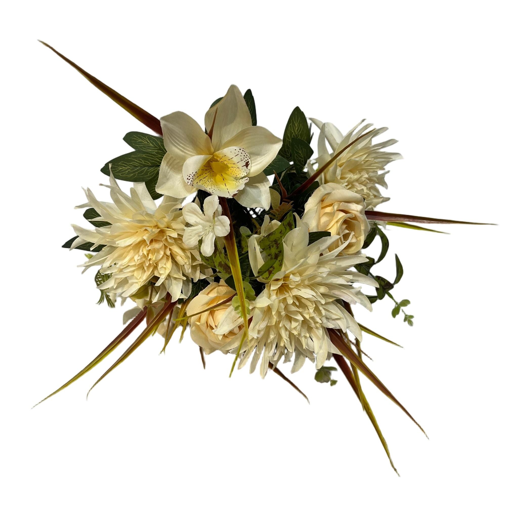 This artificial bouquet features 12 branches combining beautifully detailed dahlias and roses, each standing 48 cm tall. Crafted to replicate the vivid colors and natural textures of fresh flowers, it is perfect for elegant home décor, weddings, and special events. Made from premium materials, the bouquet offers long-lasting beauty without the need for maintenance.