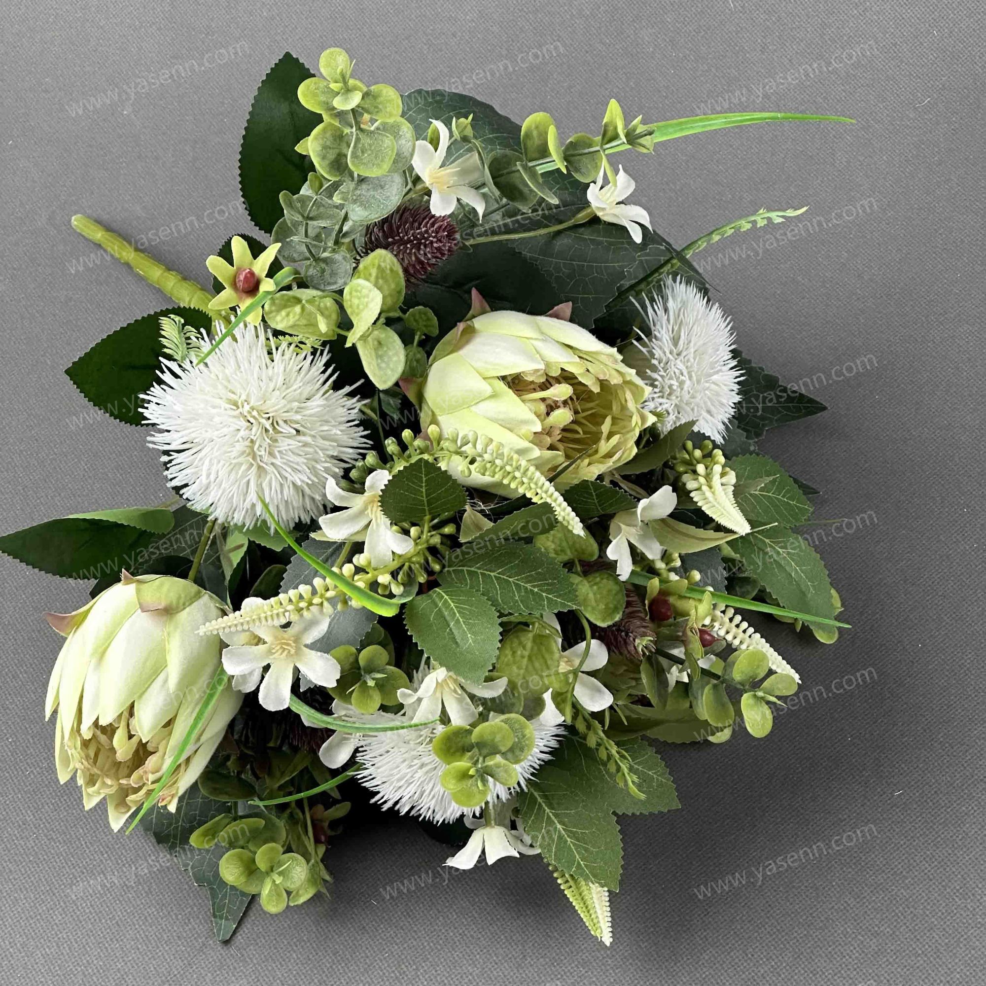 HEIGHT 43CM/14 DANDELION/3 PROTEA 4 DANDELION 7PCS FITTINGS/DIA 6CM 7.5CM/3 LAYERS 4LAYERS/PONGEE PLASTIC/5 LARGE LEAVES 14 THREE EARED LEAVES 3 PAIRS OF LEAVES
