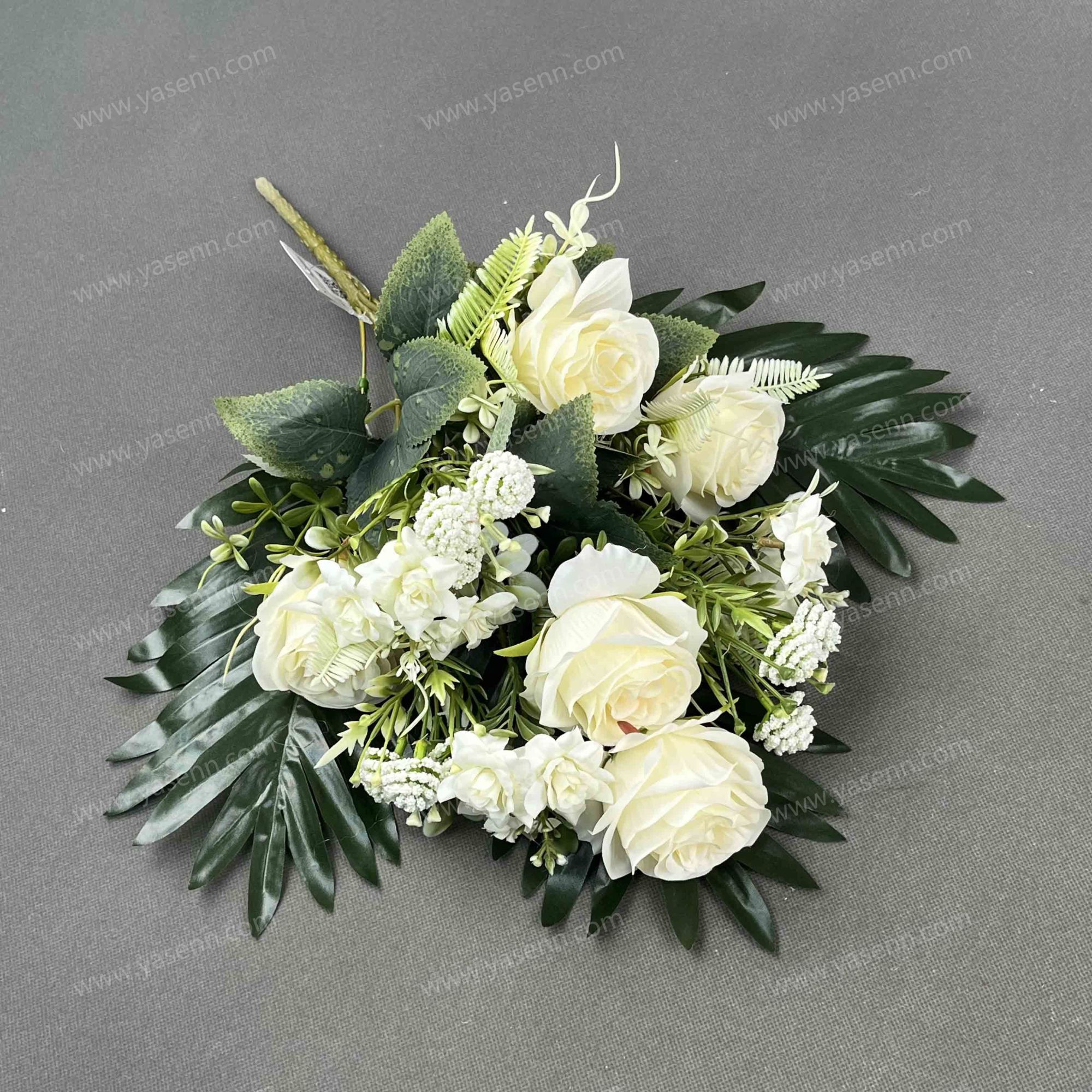 HEIGHT 46CM / 11 ROSE / 5 BIG FLOWERS 9 SMALL FLOWERS 3 FITTINGS /DIA 8CM 4.5CM /10,4 LAYERS/ PONGEE PLASTICS / 11 LEAVES