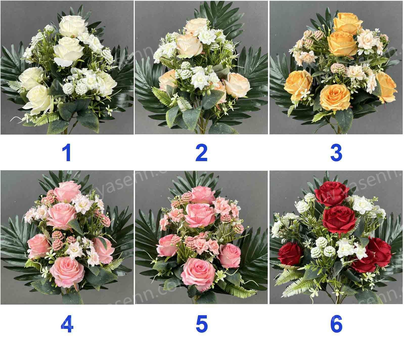 Description:HEIGHT 46CM / 11 ROSE / 5 BIG FLOWERS 9 SMALL FLOWERS 3 FITTINGS /DIA 8CM 4.5CM /10,4 LAYERS/ PONGEE PLASTICS / 11 LEAVES