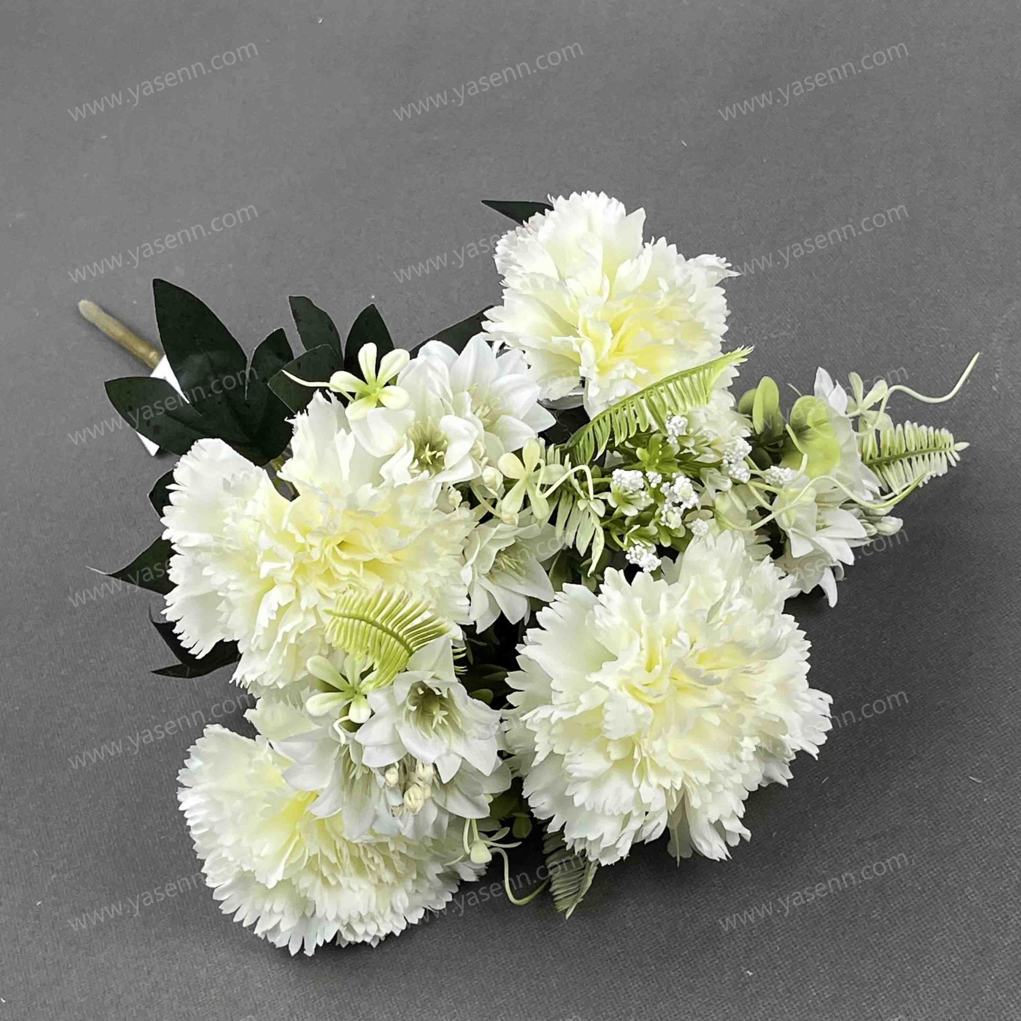 HEIGHT 50CM / 10 CARNATION / 5 CARNATION 9 SMALL FLOWERS 2 FITTINGS /DIA 11.5CM 6.5CM / 9 ,2 LAYERS/ PONGEE/ 7 LEAVES
