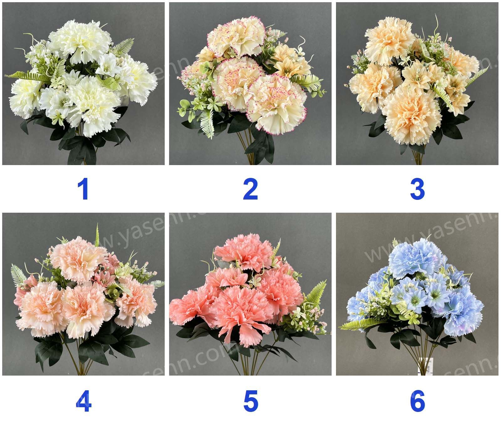 Description:HEIGHT 50CM / 10 CARNATION / 5 CARNATION 9 SMALL FLOWERS 2 FITTINGS /DIA 11.5CM 6.5CM / 9 ,2 LAYERS/ PONGEE/ 7 LEAVES