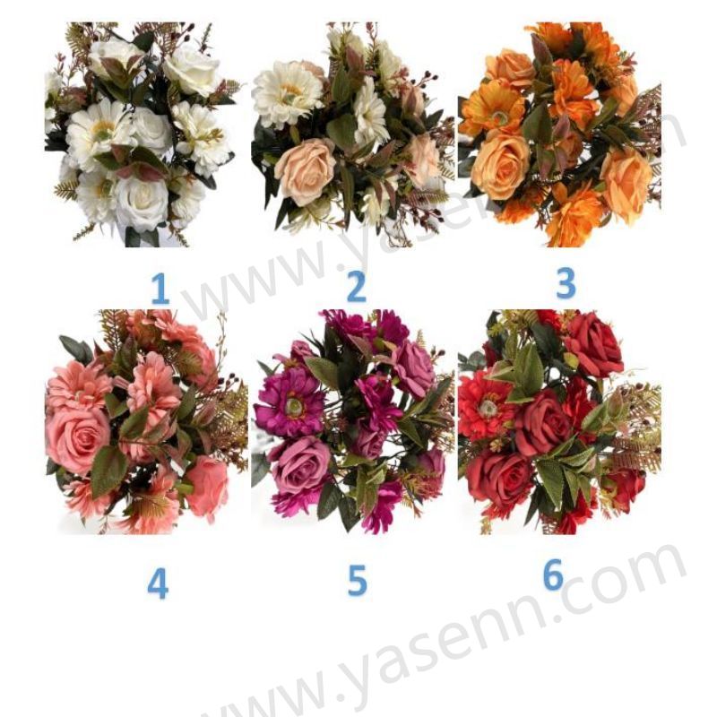 Description:HEIGHT 50CM / 18 BRANCHES / 5 ROSE 6 CHRYSANTHEMUM 7 FITTINGS / DIA 8CM 11CM / FLOCKED PONGEE SATIN/ 13PCS LEAVES